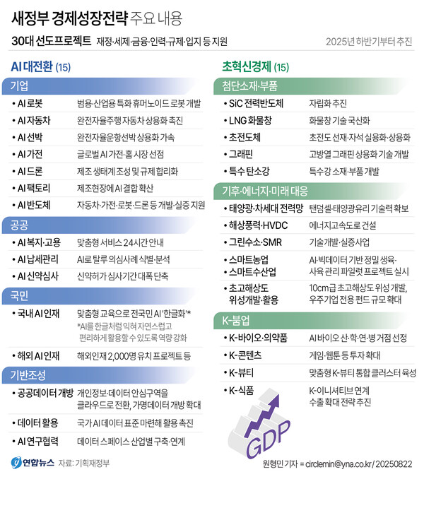이재명 정부가 기업주도 기술 혁신을 중심으로 ‘30대 선도 프로젝트’를 띄운다. 기업·공공 전 부문의 인공지능(AI) 대전환을 위한 과제 15개, 첨단소재부품·기후에너지·미래대응 중심의 초혁신경제 과제 15개씩이다. 이를 통해 성장을 강력하게 견인하겠다는 것이다. 5년 내 구체적인 성과를 창출하기 위해 재정·세제·금융·인력·규제·입지 패키지를 총동원한다. 기업이 앞장서고 주무 부처와 기획재정부가 전방위 뒷받침하는 방식으로 경제 패러다임을 전환해 잠재성장률 3%의 ‘진짜 성장’을 이루겠다는 청사진이다. 이재명 정부의 성장전략이 본격적으로 모습을 드러낸 것이다.