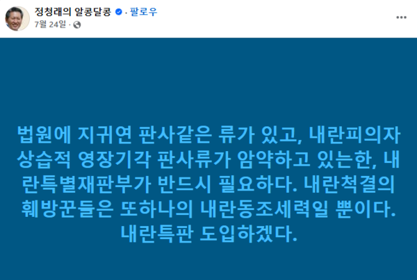 내란특별재판부 도입은 민주당 8·2 전당대회 당시 당권주자였던 정 대표의 공약 사항이기도 하다. 정 대표는 지난달 24일 페이스북에서 "법원에 지귀연 판사 같은 류가 있고, 내란 피의자 상습적 영장 기각 판사류가 암약하고 있는 한 내란특별재판부가 반드시 필요하다"며 "내란 척결의 훼방꾼들은 또 하나의 내란 동조 세력일 뿐이다. '내란특판'을 도입하겠다"고 공언한 바 있다.