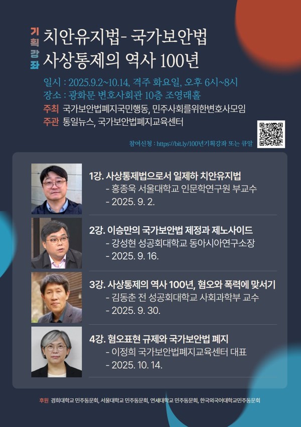 ‘치안유지법-국가보안법 사상통제의 역사 100년’ 기획강좌는 1강 “사상통제법으로서의 일제하 치안유지법”(홍종욱), 2강 “이승만의 국가보안법 제정과 제노사이드”(강성현), 3강 “사상통제의 역사 100년, 혐오와 폭력에 맞서기”(김동춘), 마지막 4강 “혐오표현 규제와 국가보안법 폐지”(이정희)가 진행됐으며, 이후 단행본으로 출간될 예정이다.