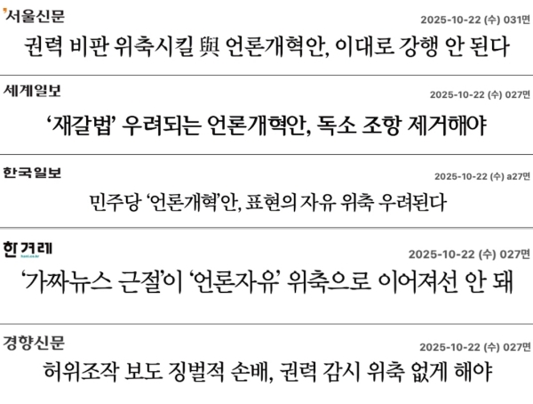 경향신문 사설 <허위조작 보도 징벌적 손배, 권력 감시 위축 없게 해야>의 경우 허위조작정보 근절 필요성 관련해 “윤석열의 12·3 내란 후 스카이데일리가 중국인이 한국 선거에 개입했다 는 식의 허위 사실을 보도하고, 정치적 갈등을 심화시킨 사례를 목도했다”면서도 “윤석열 정부 때 이 제도가 있었다면, 김건희 의혹 보도는 어려움에 처했을 것”이라고 지적했다. 예컨대 “김건희가 허위 경력 의혹을 취재하는 YTN 기자에게 복수 운운하는 걸 목도하지 않았는가”라며 “정부와 여당은 헌법상 표현의 자유를 보장하고, 권력가 입맛에 따라 손배를 오남용하지 못하도록 법안을 숙의하고 정밀 설계해야 한다”고 했다.