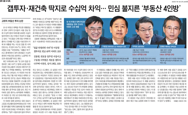 조선일보는 3면 <갭투자·재건축 딱지로 수십억 차익… 민심 불지른 ‘부동산 4인방’>에서 이상경 국토교통부 차관, 구윤철 경제부총리 겸 기획재정부 장관, 이억원 금융위원장, 김용범 대통령실 정책실장 등의 아파트 소유 현황과 논란 등을 전했다.
