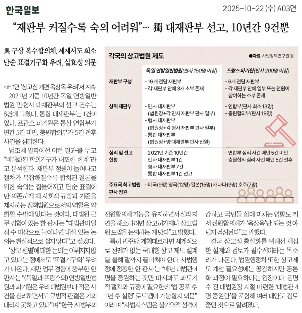 한국일보는 <“與 상고심 개편, 옥상옥 우려” 혼란 가중> 및 이어진 기사에서 독일, 프랑스 등 상고법원 제도를 분석했다. “상고법원에 2개 이상의 합의부를 둔 것은 최고 법 해석기관으로서의 역할을 위한 장치지만 실제 활동의 실효성에 의문이 생긴다”며 “재판부 정원이 늘어나고 절차가 복잡해질 수록 합치된 결론을 위한 숙의는 힘들어지고 단순 표결에만 의존하게 돼 사회적 규범과 기준을 제시하는 정책법원으로서의 역할은 약화할 수밖에 없다”는 해석이다.