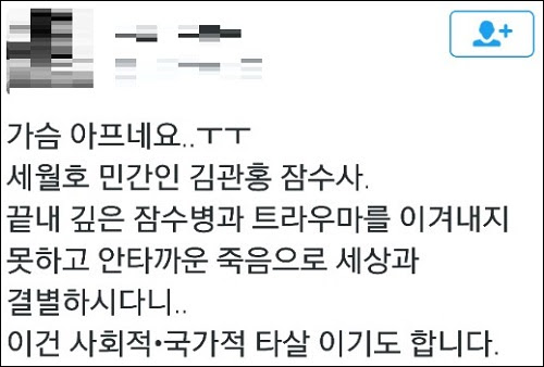 트위터 이용자 ‘@imh****’는 “김관홍 잠수사의 죽음이 너무 안타깝고 목숨 걸고 사투를 벌인 의인들이 죽음으로 내몰리는 현 상황에 분노가 치밀어 오른다”며 “일면식도 없는 분이지만 김관홍 잠수사의 명복을 빕니다. 부디 하늘나라에서는 평안하십시오”라고 애도를 표했다.