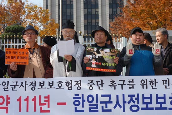 사회를 맡은 윤승길 한민족운동단체연합 사무총장은 “대통령이 한일군사정보보호협정 스스로 반대하고 일본에 반대의견을 내기 바란다”고 말하고 “일본의 군사식민지를 만드는 1단계 협정을 반대한다”고 말했다.