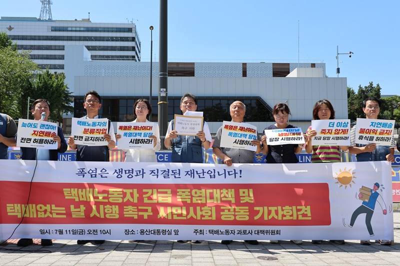 이에 민주노총 서비스연맹 전국택배노동조합과 시민사회 등이 구성한 ‘택배노동자 과로사 대책위원회’는 같은 날 서울 용산 대통령실 앞에서 연 기자회견을 통해 ▲지연 배송에 따른 불이익 조치 금지 ▲택배 터미널과 물류센터 등의 긴급 냉방 대책 실시 ▲폭염 시기 택배배송노동자들의 분류작업 수행 금지 ▲폭염 시 집하, 배송 외 업무 금지 ▲택배 없는 날(8월 14일)에 전 택배사 참여 등 택배노동자들에 대한 긴급 폭염 대책을 촉구했다.