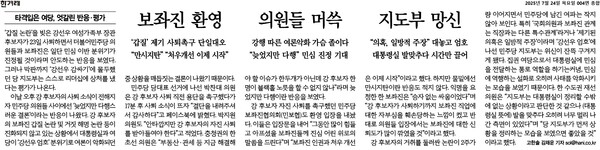 한겨레는 강 의원 자진사퇴로 여당 피해가 막심하다고 밝혔다. 한겨레는 4면 <보좌진 환영, 의원들 머쓱, 지도부 망신> 보도에서 “막판까지 ‘강선우 감싸기’에 몰두했던 당 지도부는 스스로 리더십에 상처를 냈다는 평가가 나온다”며 “집권 여당으로서 대통령실에 민심을 전달하는 통로 역할을 하기는커녕, 민심에 역행하는 설화로 오히려 사태를 악화시키는 모습을 보였기 때문”이라고 지적했다.