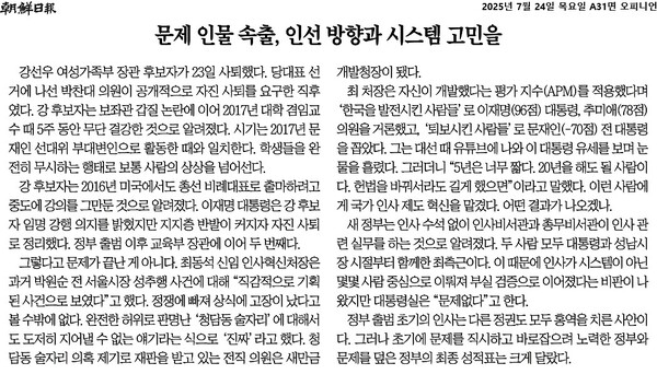 중앙일보도 사설 <강선우 사퇴 당연한 결정…허술한 인사시스템 점검해야>에서 “과거 민주당 계열 정부에선 인사수석을 두고 비서실장 등이 참여하는 인사추천위원회를 공식 가동하곤 했다. 하지만 현 정부에선 추천과 심사 과정이 공유되지 않는 ‘밀실 인사’가 문제란 지적이 나온다”며 “세간엔 이 대통령의 최측근인 ‘성남·경기 라인’이 인사를 결정한다는 얘기가 돈다”고 했다.