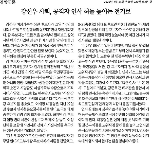 한겨레는 <강선우 사퇴, 늦었지만 바른 선택이다> 사설에서 “강 후보자가 사퇴했다고 아무 일도 없었다는 듯 덮고 갈 수는 없다. 자칫 새 정부에도 전임 정부처럼 ‘오기’와 ‘불통’의 부정적 이미지가 덧씌워질 수 있는 중대한 분기점이었다”며 “깊이 성찰하고 바꿔 나가야 한다”고 했다. 경향신문도 <강선우 사퇴, 공직자 인사 허들 높이는 전기로> 사설을 통해 “인사 리스크는 부실 검증 문제를 넘어 새 정부의 허술한 인사 시스템과 원칙을 되묻는 지경에 이르렀다”며 “대통령실은 현역 의원 첫 낙마로 기록될 강선우 파동을 고위직 검증 허들을 높이고 인사검증시스템을 재정비하는 계기로 삼아야 한다”고 했다.