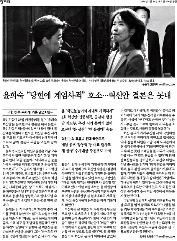한겨레는 6면 <윤희숙 “당헌에 개엄사죄” 호소… 혁신안 결론은 못내> 보도에서 “국민의힘은 혁신안의 일부 내용에 당내 공감대를 이뤘다고 했지만, 혁신안 추진 시기를 두고 당 지도부와 혁신위의 견해차가 해소되지 않아 갈등의 뇌관은 여전히 남아있다”고 했다.