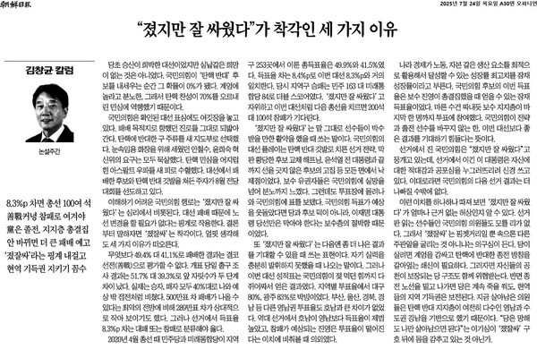 김창균 조선일보 논설주간 역시 칼럼 <“졌지만 잘 싸웠다”가 착각인 세 가지 이유>에서 “당이 살려면 계엄을 감싸고 탄핵에 반대한 종전 방침을 갈아엎는 쇄신이 필요하다”며 “반면 종전 노선을 밀고 나가면 당은 계속 죽을 쒀도, 현역들의 지역 기득권은 보전된다. 지금 살아남은 의원들은 탄핵 반대 지지층이 여전히 다수인 영남과 수도권 강남을 기반으로 했기 때문이다. ‘당은 망해도 나만 살아 남으면 된다’는 이기심이 ‘졌잘싸’ 구호 뒤에 몸을 감추고 있는 것 아닌가”라고 했다.