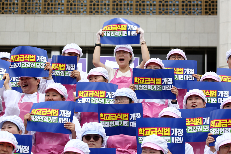 노동계·시민사회, ‘제2의’ 대국민 운동 돌입작업복을 입은 학교급식조리사들이 지난 7월 2일 서울 여의도 국회 본청 계단에서 열린 민주노총 서비스연맹 전국학교비정규직노동조합 '학교급식 노동자 건강과 안전 확보를 위한 학교급식법 개정안 발의 기자회견'에서 손팻말을 들고 있다. 2025.07.02 ⓒ민중의소리