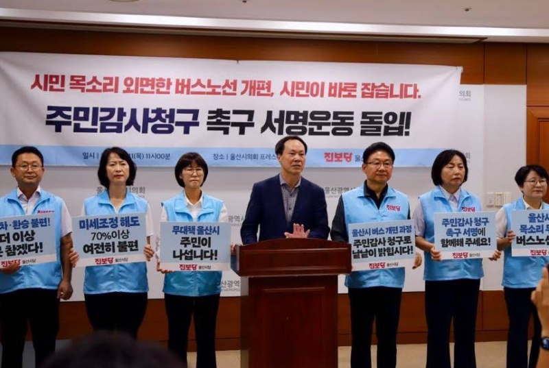 진보당 울산시당 관계자는 "서명에 참여하는 주민이 줄어들고 있지 않아서 목표 인원인 1만 명을 넘어섰지만 계속 서명을 받고 있는 상황"이라고 밝혔다. 주민감사청구 요건은 청구인 300명 이상이기 때문에, 진보당 울산시당은 당장 주민감사청구를 할 수도 있지만, 주민 여론을 더 모으겠다는 계획이다. 추석 연휴를 보내고 10월 23일 울산시청 앞에서 대규모 주민 집회도 열 방침이다.진보당 울산시당이 지난 9월 11일 버스 노선 개편에 대한 주민감사청구를 촉구하는 서명 운동을 선포하는 기자회견을 하고 있다. ⓒ진보당 울산시당 제공 시민 편의성보다 버스 업체 이익?