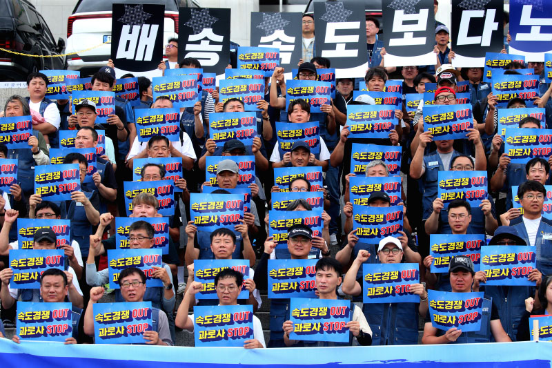 발행 2025-11-07 14:36:59 전국택배노동조합 조합원들이 지난 9월 1일 오전 서울 여의도 국회에서 열린 '택배노동자 과로 방지를 위한 제3차 사회적 합의 추진 선포 기자회견'에서 손피켓을 들고 구호를 외치고 있다. 2025.09.01 ⓒ민중의소리